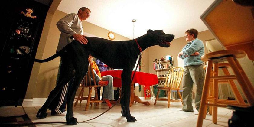 Итак, самая большая собака в мире, фото которой можно видеть даже в книге рекордов – это Зевс, который, к сожалению, умер в 2014 году. Собака имела вес более 70 кг, ее рост превышал в холке 112 см, а в день такому питомцу требовалось порядка 14 кг корма. Но даже при такой, казалось бы, внушительной диете собака была довольно худой – перекармливать ее было нельзя, иначе на суставы бы пришлась непосильная нагрузка. Несмотря на все усилия ветеринаров и хозяев, собака прожила всего 5 лет – вот она, плата за гигантизм. Зевс относился к породе немецких догов, любил активную жизнь и игры, которые, к сожалению, могли иметь разрушительный эффект из-за больших габаритов и веса пса, который до конца своих дней не перестал быть щенком в душе.