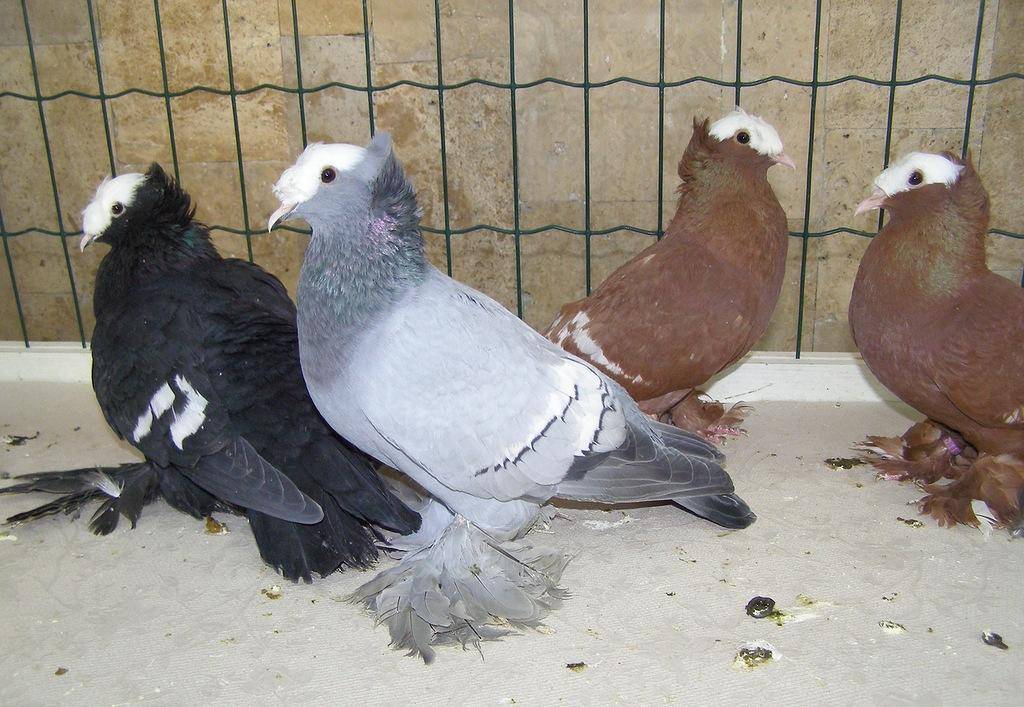 Милые голуби с обильным оперением на лапах могут иметь разную окраску пера и обязательное белое пятно на головке.