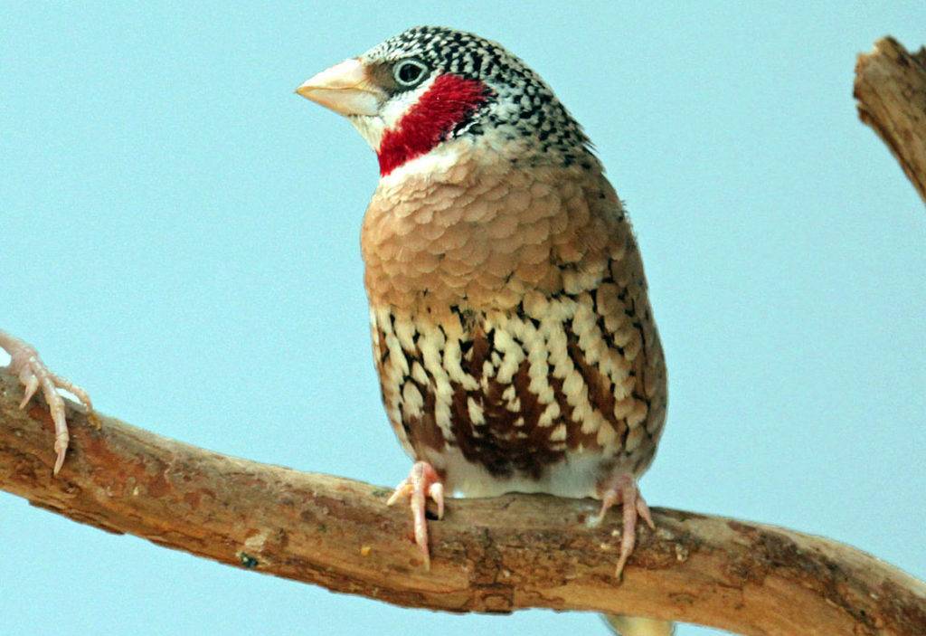 - Красноголовые и красногорлые амадины имеют характерные различия и цвет оперения. Самцы имеют отличительную особенность – у первого вида голова имеет красный цвет, у второго на горле есть красная полоса. Размер особей средний, длина взрослой птицы достигает 14 см.