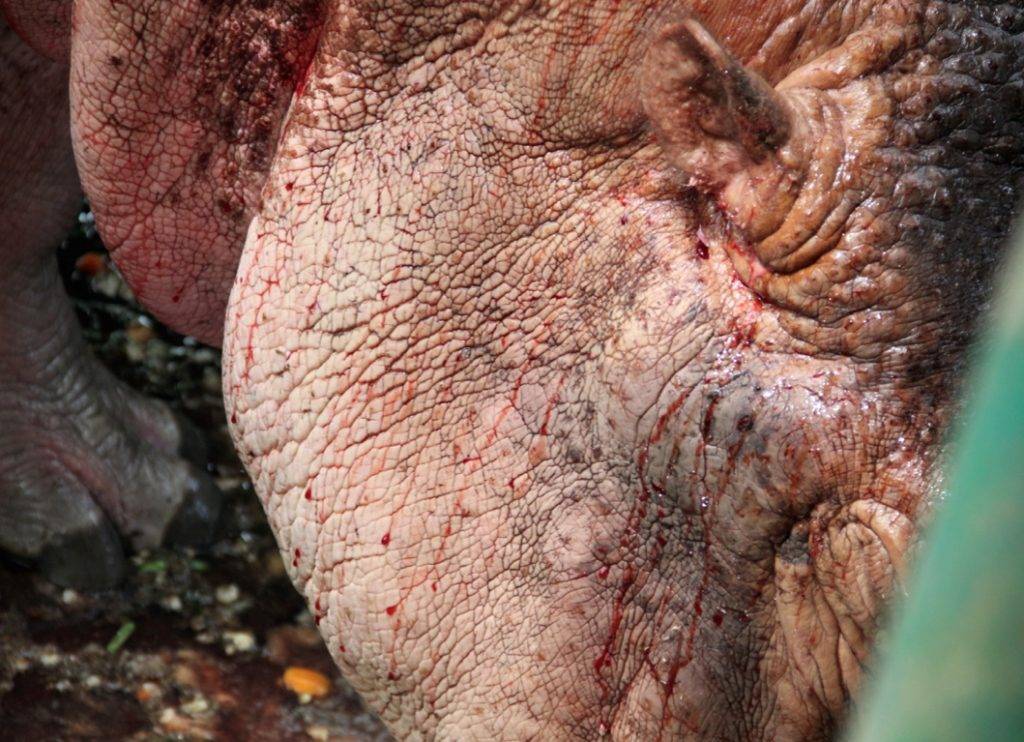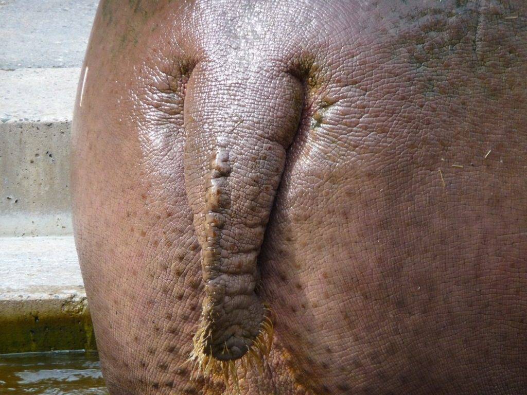 Гиппопотам – чрезвычайно толстокожее животное, только у основания хвоста шкура тонкая, а по всему телу толщина кожи составляет 4 см. Цвет спины бегемота серый или серо-коричневый. Брюхо, а также области вокруг глаз и ушей розовые. Шерсти практически нет, за исключением коротких щетинок на кончике хвоста и ушей. Очень редкие, едва заметные глазу шерстины растут по бокам и на животе.