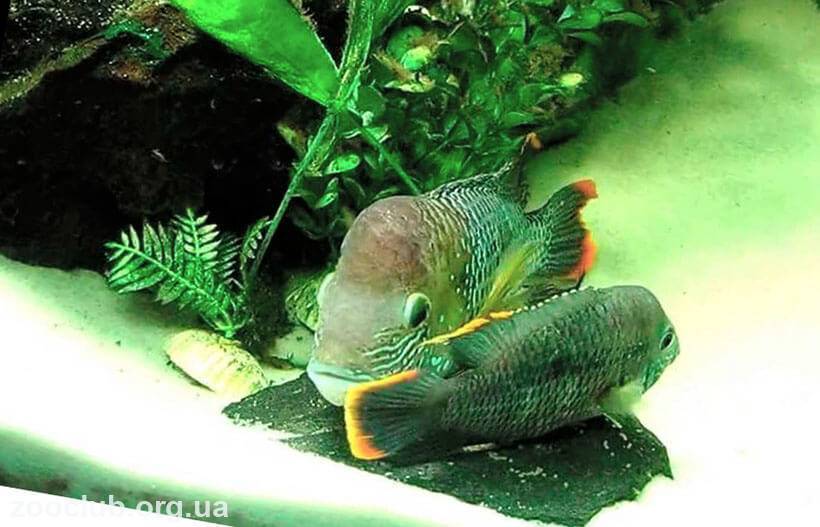Пара чистит камень, корягу или стекло на дне, куда впоследствии будет отложено до 600 икринок. Одновременно они выкапывают в грунте ямки для укрытия будущего потомства. Уход за икрой осуществляют оба родителя. Если рыбы начнут поедать икру, то ее нужно будет перенести в отдельную емкость.