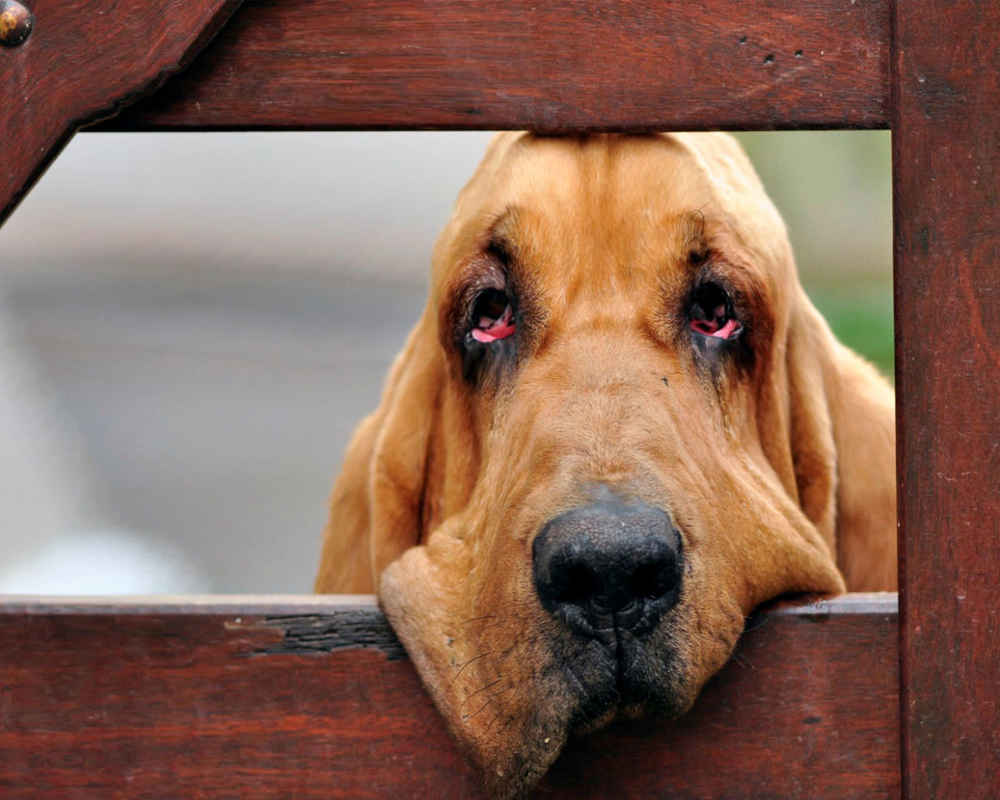 | Глаза | Средние, немного вытянутые. Нижнее веко отвислое, что вызывает легкое покраснение глазного яблока. Цвет радужки карий у Сент-Юберских собак темной масти, янтарный при более светлой окраске. Взгляд внимательный и добрый. На фото бладхаунд выглядит меланхоличным и немного грустным. |