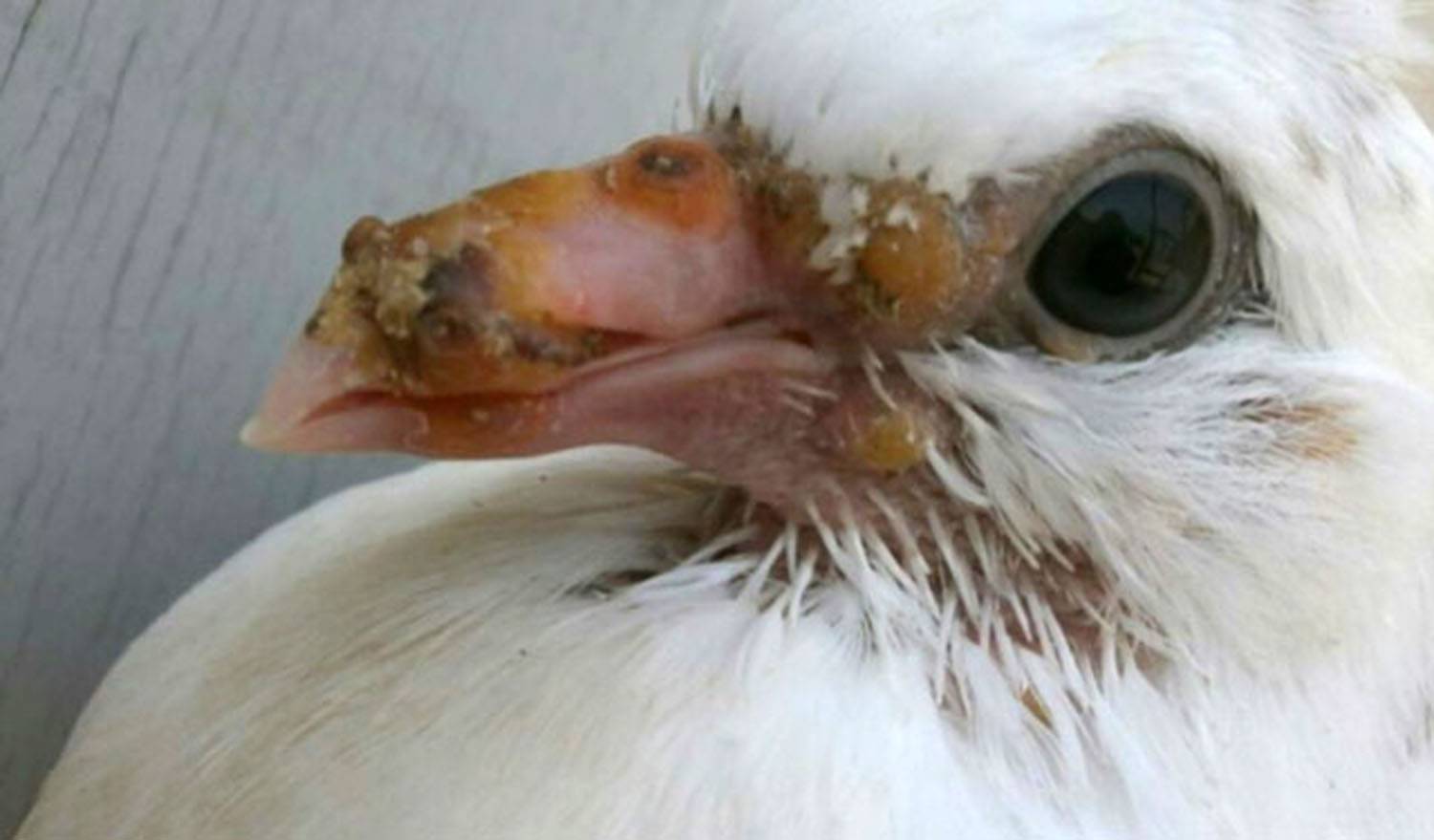 Оспа голубей проявляется высыпаниями на голове, клюве и лапах