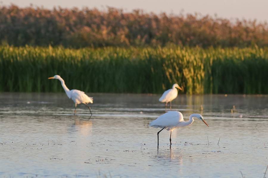 Большая белая цапля часто охотится вместе со своими соплеменниками, при этом отбирая пищу у более мелких птиц.
