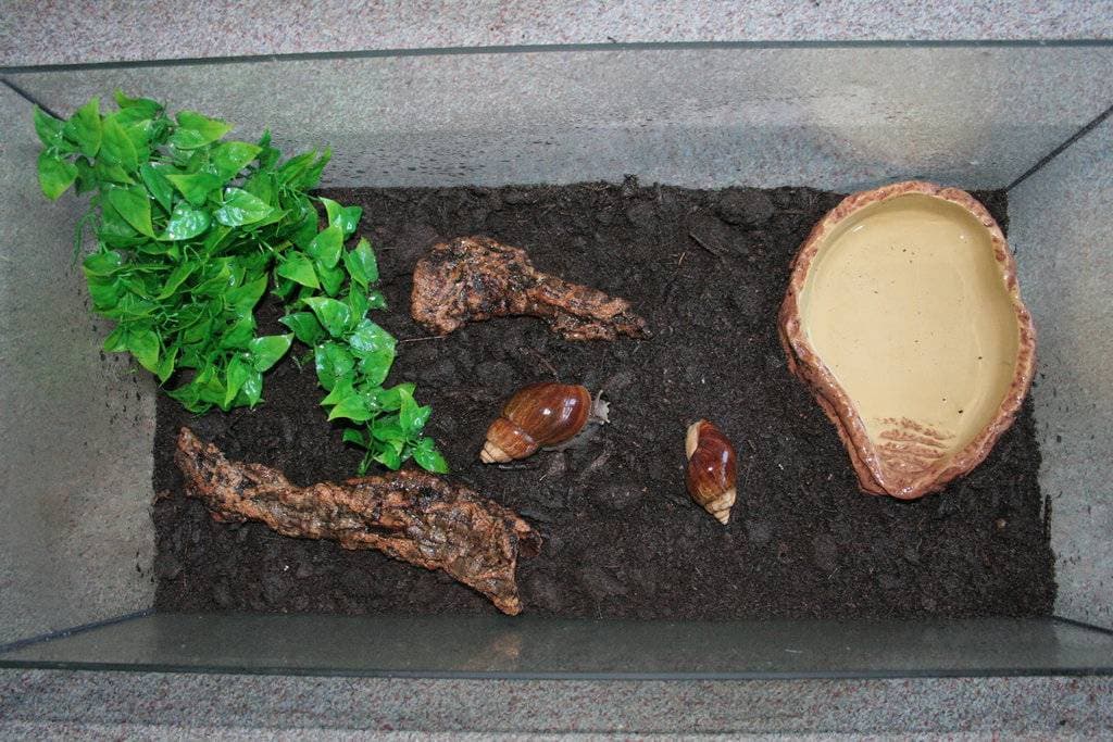 Домик улитки должен быть комфортным и безопасным. В качестве места обитания можно использовать аквариум, оставшийся после рыбок, террариум из плексигласа либо пластика, подойдёт и контейнер из прозрачного пластика, для улитки ахатина главное условие – воздух и пространство. Для особи среднего размера необходим контейнер не менее 3 литров. Аквариум или бокс должны быть накрыты крышкой, так как моллюски способны ползать по всей поверхности, также в ней необходимо проделать несколько отверстий, но такого размера, чтобы через них моллюск не уполз