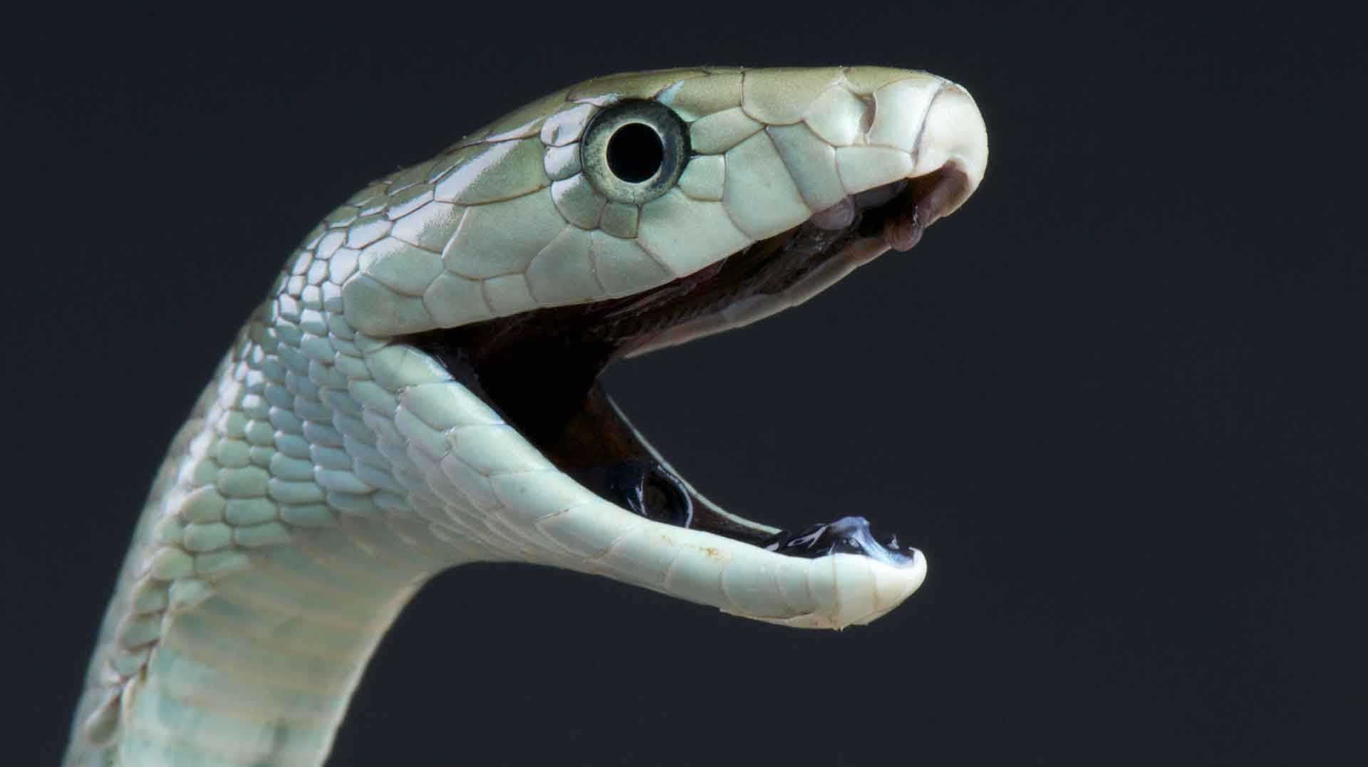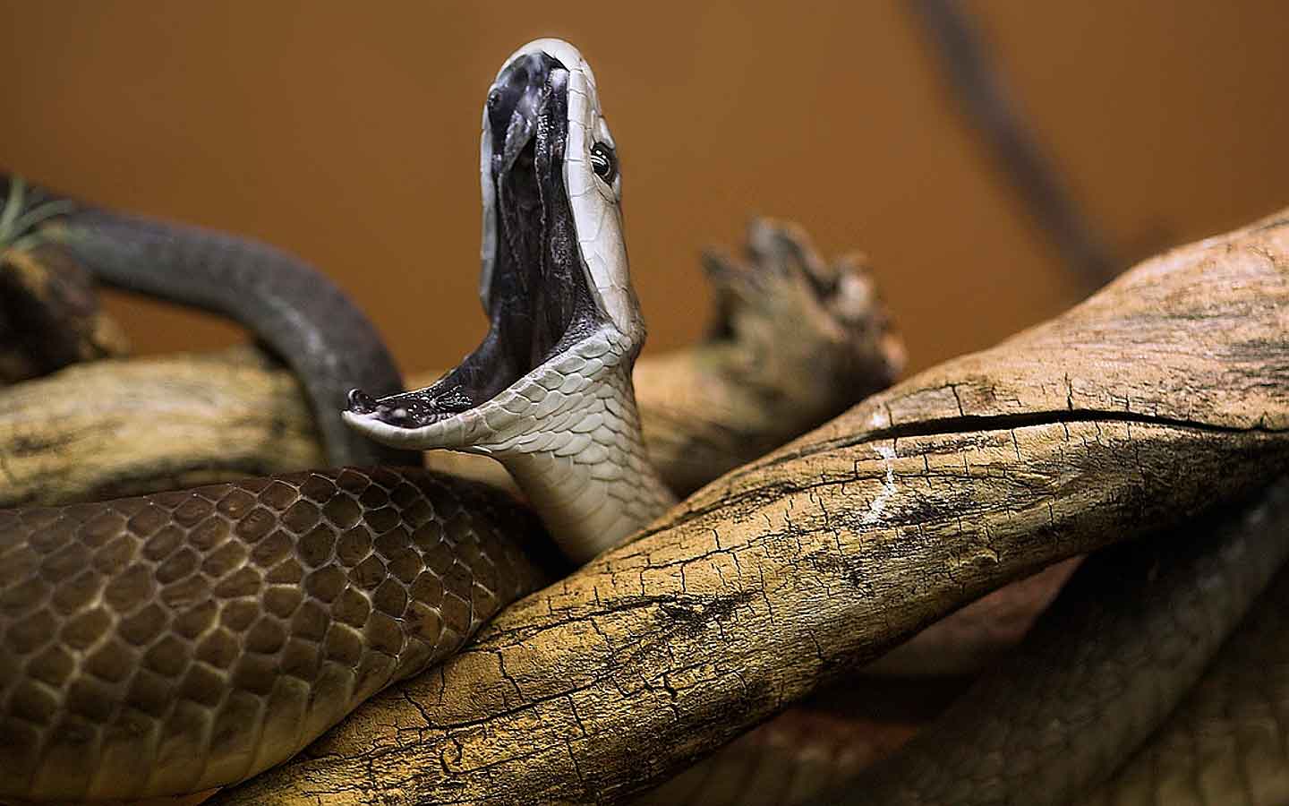 Черная мамба в оборонительной позе. Подобно кобрам, черная мамба может растянуть шею в капюшон, чтобы запугать потенциальные угрозы (показано здесь).
