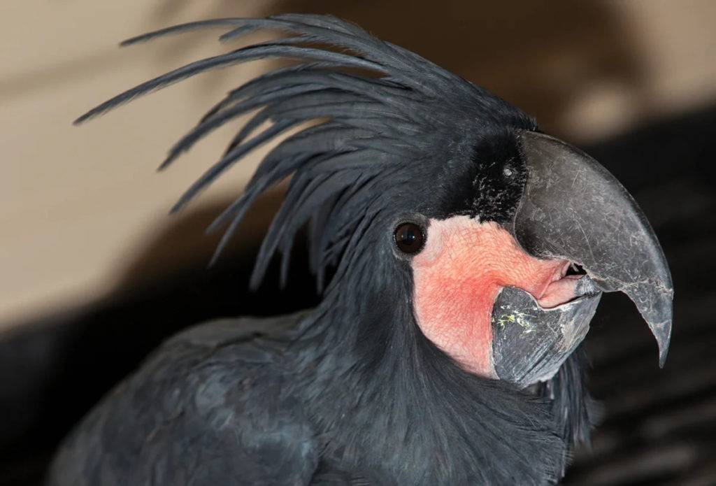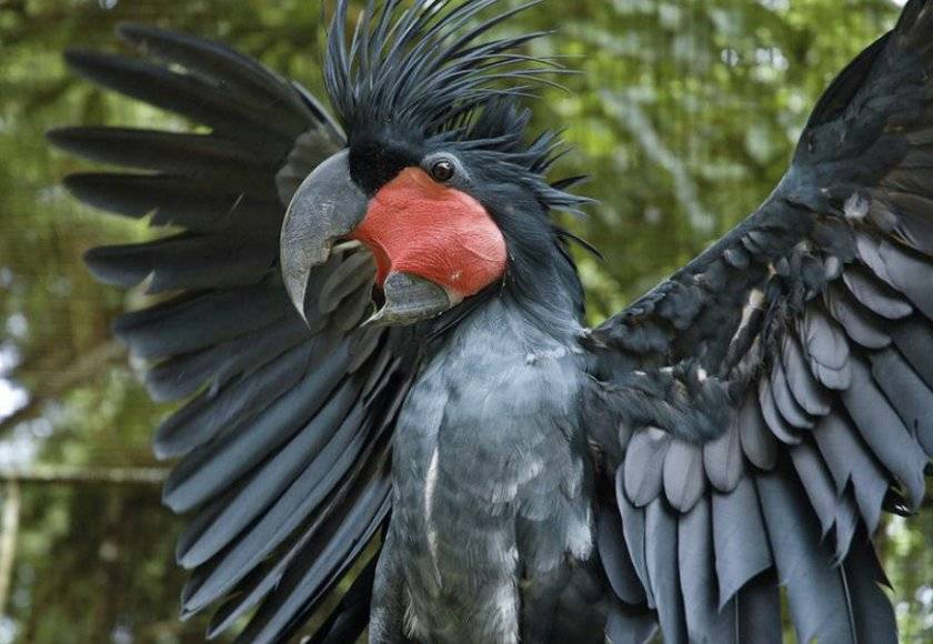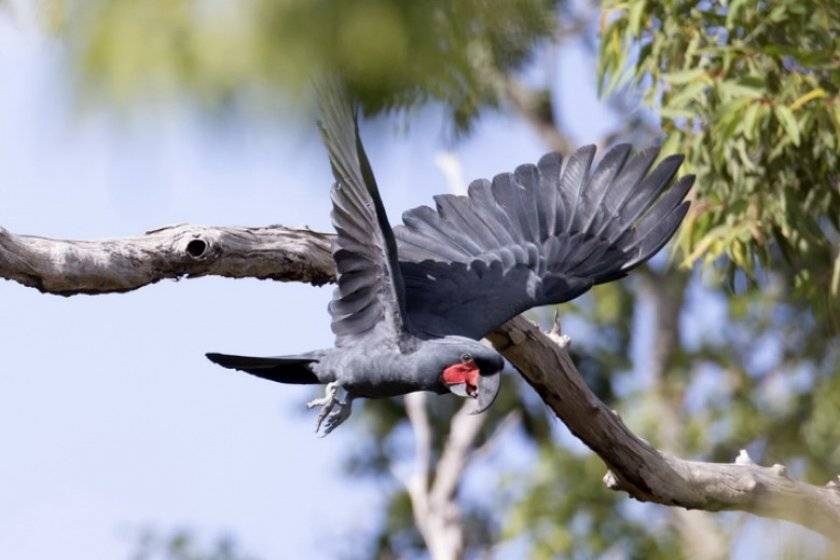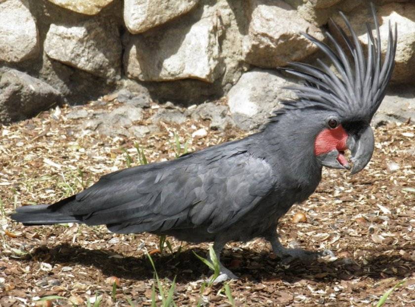 Чёрный пальмовый какаду — редкий вид австралийского попугая, который отличается внушительными размерами, а также своей уникальной особенностью демонстрировать своё настроение: спокойная птица имеет равномерный чёрный окрас, а когда пернатое испытывает злость или раздражённость — щёки становятся ярко-алого цвета. В этот момент к попугаю лучше не приближаться, ибо данные представители не скупятся на клевание и избивание крыльями источника раздражения.