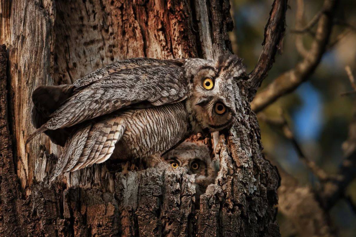 На фото филин с птенцами