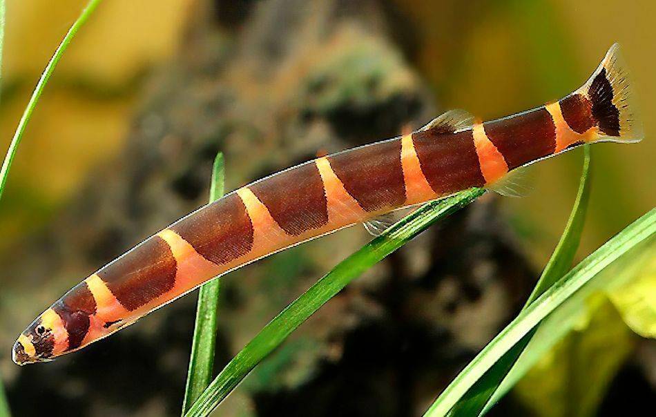 Относящаяся к вьюнам, она чем то напоминает маленькую змею. Но при этом совершенно неопасная, и довольно вынослива. Акантофтальмус часто прячется в течение дня, и что бы он себя комфортно чувствовал ему нужны укрытия и мягкий грунт, в котором он любит копаться.