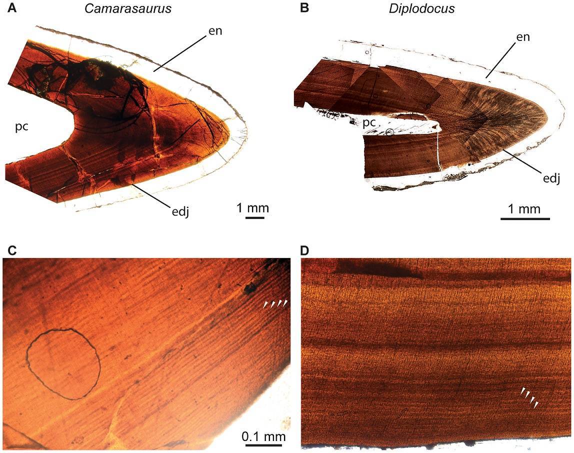 Гистологические срезу зубов камаразавра и диплодока.Тонкие срезы премаксиллярных зубов камаразавра (А, C) и диплодока (B, D) показывает инкрементные линии фон Эбнера (белые стрелки) в дентине. Зубы ориентированы длинной осью горизонтально, а окклюзионная поверхность направлена вправо. А – кончик зуба Камаразавра, B – кончик зуба диплодока. C и D-увеличенные изображения кончика зуба соответственно. Сокращения: edj – эмалево-дентинное соединение; en – эмаль; pc – пульпарная камера.