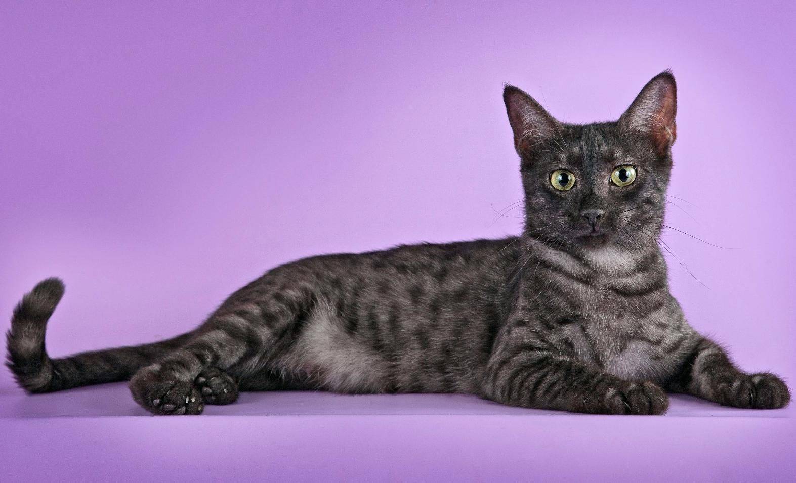 - дымчатый окрас — самый редкий вид. Фон окраса выступает темно-серым или черным. Из-за темной шерсти на теле кошки практически не видны пятна;