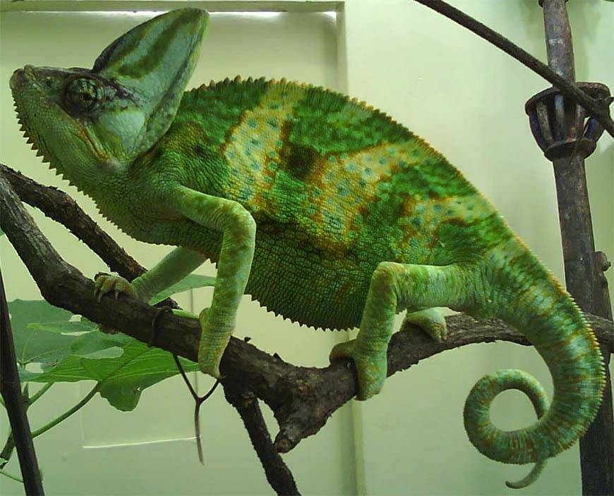 Это насекомоядные ящерицы, требующие большого пространства — террариум до 120 литров по объёму, в котором должен быть мини-водоём, подогрев, ветки дерева и хорошая вентиляция. При этом раз в два дня вам придётся чистить жилище своего питомца. Хамелеоны живут по одиночке, поэтому не стоит подселять в один террариум 2 особей этих ящериц. Самой главной пищей для хамелеонов являются сверчки и тараканы. Хамелеоны питаются и другими насекомыми, а также червями, маленькими мышатами, бананами, сочными листьями растений.