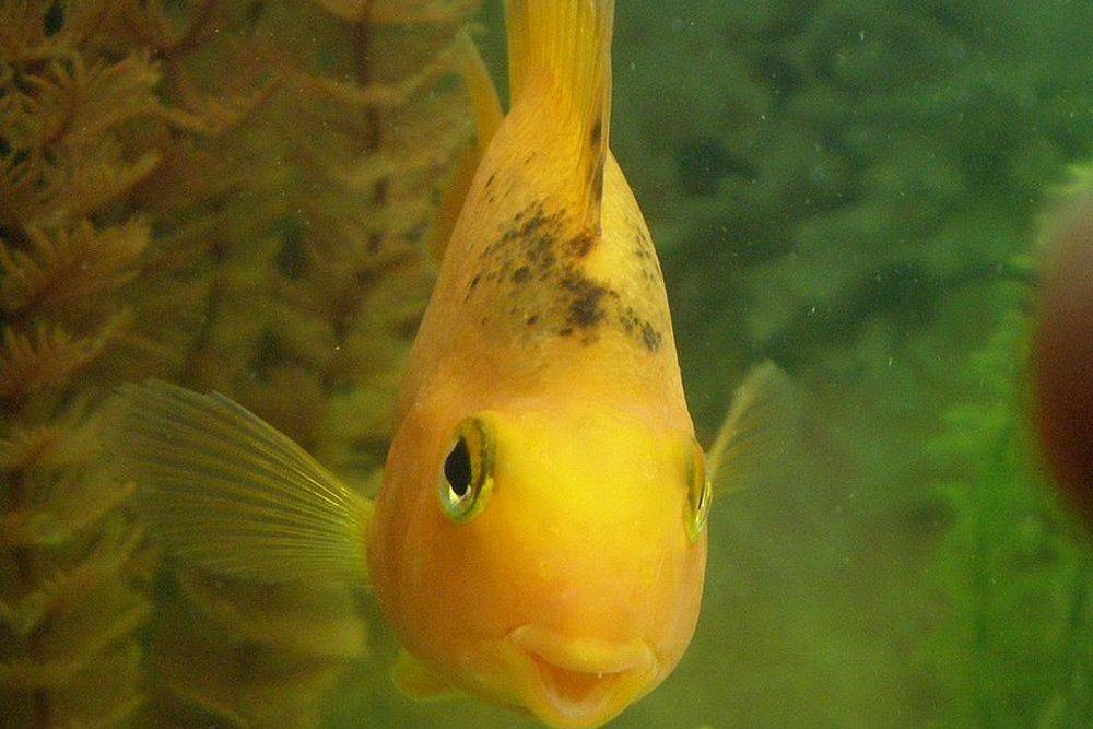 Иногда рыбы-попугаи могут вести себя странно, например, плохо (бочком) перемещаться по аквариуму или вовсе лечь на дно.
