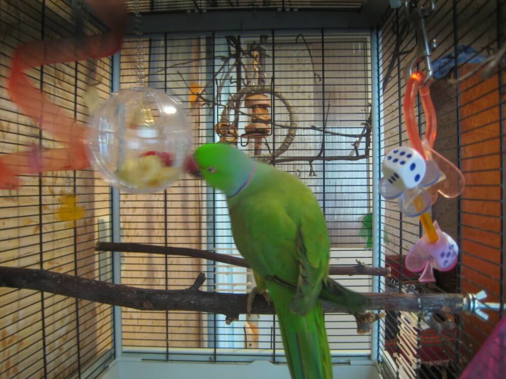 Попугаям необходимы безопасные, выполненные из натуральных материалов игрушки. Для стачивания когтей и клюва подойдут веточки плодовых деревьев. Чтобы пернатые не скучали, им предлагают различные головоломки.
