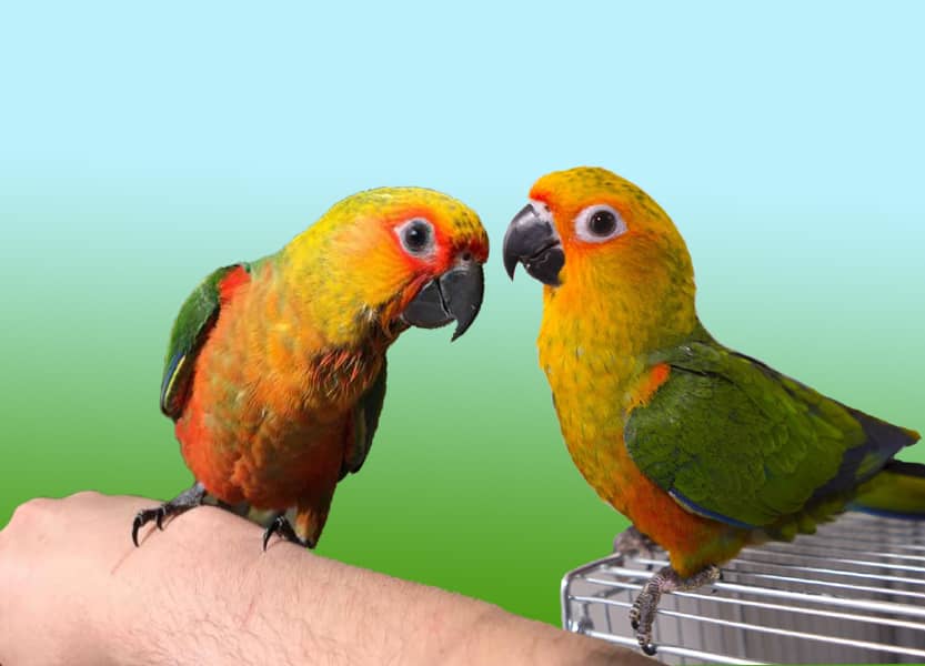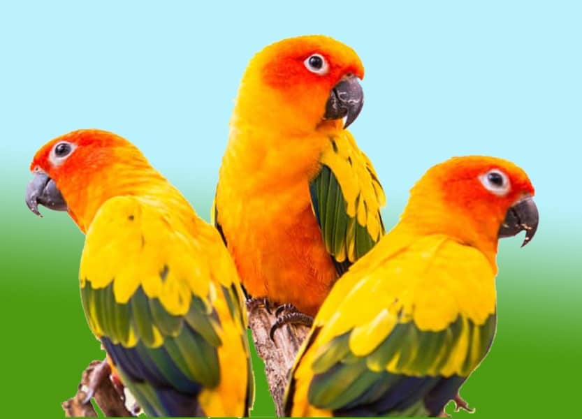 1. Солнечный аратинга. Длина от 17 до 30 сантиметров. Имеет яркую, разноцветную окраску из желтых, зеленых, синих и оранжевых перьев. Даже на фото аратинга выглядят очень красивыми.