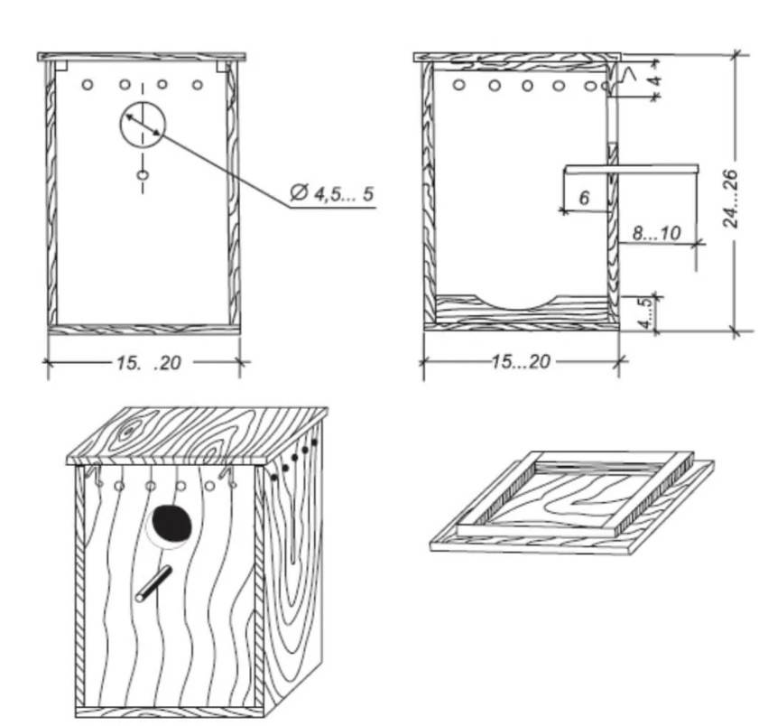 Сама конструкция гнезда достаточно проста, поэтому со сборкой не должно возникнуть проблем. Понадобиться заготовить 4 доски, которые будут служить стенами и 2 – для пола и потолка. Они могут быть изготовлены из деревянной фанеры, доски или обычного ДСП. Главное, чтобы материалы не были пропитаны какими-либо химическими составами или смесями.