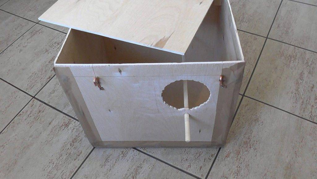 Он тоже делается из деревянных досок, но в высоту более вытянутый, нежели первый. Передняя дверца крепится на металлические угольники, посередине делается большое круглое отверстие, под ним – жердочка.