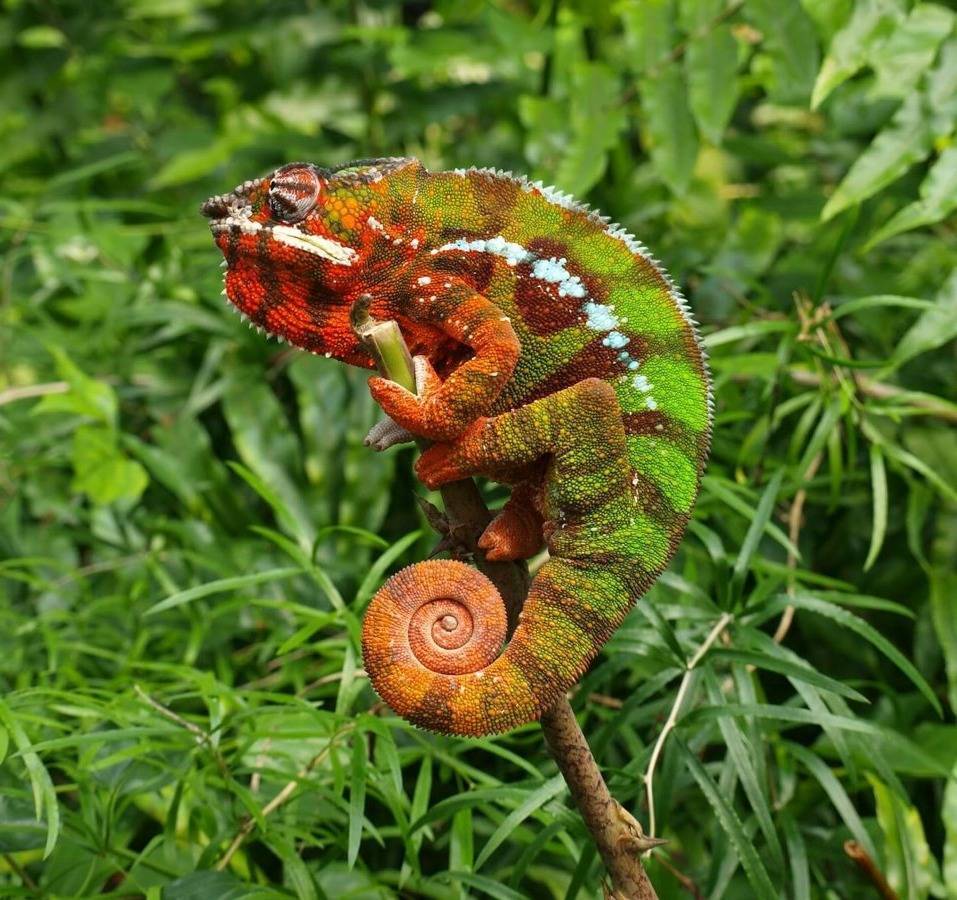 Обитающий на острове Мадагаскар гигантский хамелеон примечателен тем, что этой самый большой хамелеон в мире. Длани его тела достигает 68 см. Имеет коричневое туловище, усыпанное желтыми, зелеными и красными пятнами.