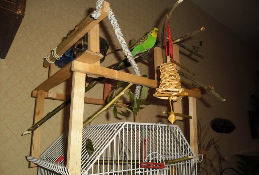 Игровые зоны для волнистых попугаев можно соорудить собственными силами. Какие-то специфические столярные навыки здесь не нужны. Главное, правильно провести расчёты, подобрать экологически чистый материал и аккуратно его обработать.
