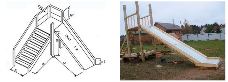 Ее можно построить из деревянных брусков, а вот непосредственно «горку» придется покупать – они продаются в магазинах спортивных принадлежностей, выполнены из высококачественного пластика. Дополнив постамент горки несколькими поперечными перекладинами, получится добавить места для каких-то спортивных игр и занятий.