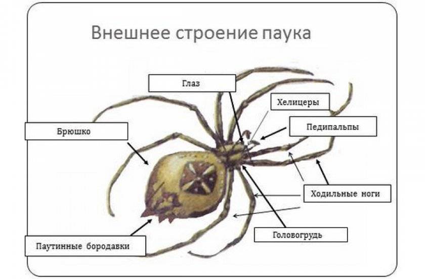 Ноги длинные, мощные, крепятся к головогруди. Количество лап, как и всех видов пауков, – 8. Брюшко выпуклое, овальной формы. Впереди головы крепкие хелицеры, педипальпы. Хелицерами хищник убивает жертву, наносит укусы, впрыскивает яд. Педипальпы – подвижные щупальца. Ими паук перемалывает, измельчает, перетирает пищу, удерживает добычу.