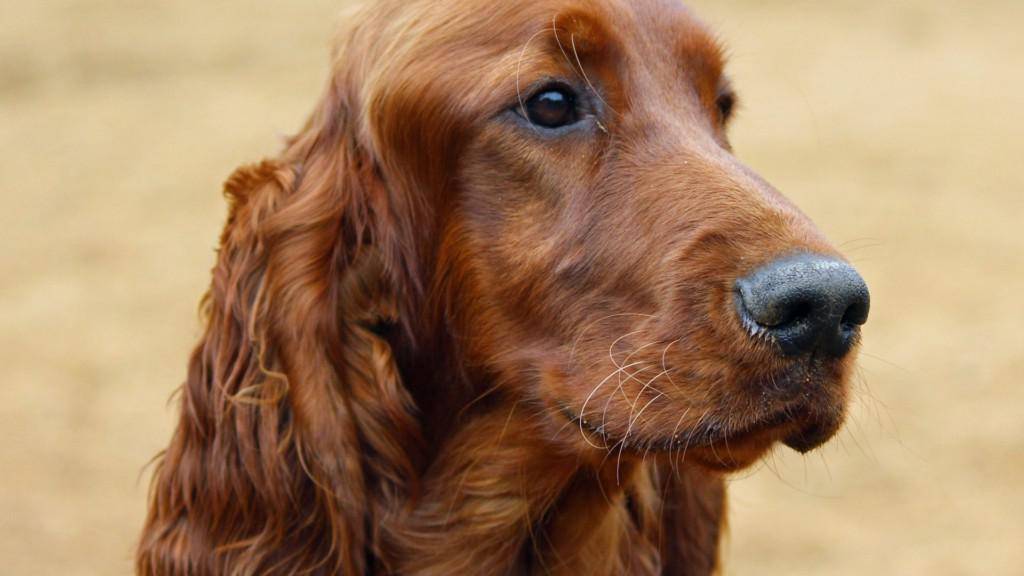 Также нужно отметить, что шерстка по своей структура не особо жесткая, но густая, средней длины. К туловищу она прилегает плотно. Длина растительности варьируется в зависимости от части тела. К примеру, на груди, ушах и задней стороне конечностей она более длинная и густая, чем на других участках тела. Глаза у породы собак ирландский сеттер миндалевидной формы, могут быть только карими — более светлыми или темными.