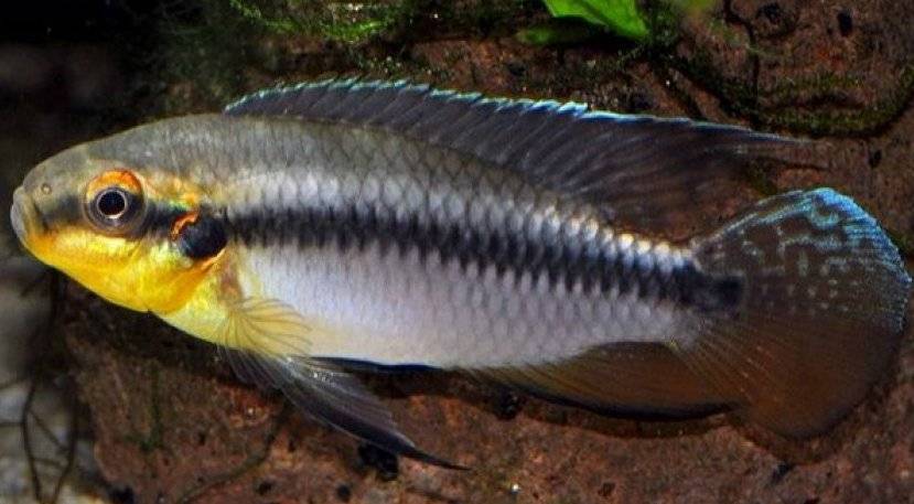 По-другому называют Крибенсисом желтобрюхим или Жёлтым. С другими видами дружит, но с сородичами мирится сложно. Длина тела этих рыбок не больше 13 см. Тело самцов с вертикальными полосами, самок отличают по розовому брюшку.