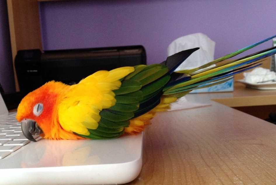 Попугаям не требуется укладываться, чтобы заснуть. Владельцы порой беспокоятся насчет того, как спит попугай в сидячем положении: удобно ли ему. Встречаются индивидуумы, которым не привыкать спать на животе, но это, скорее, исключение.