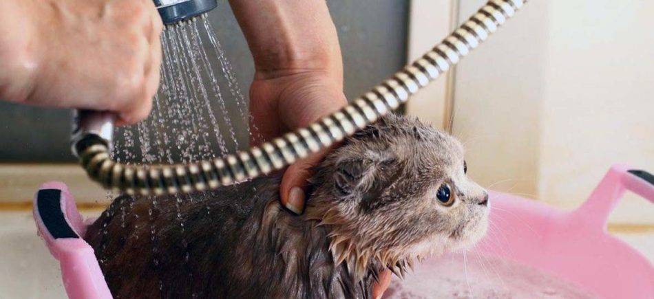 Следует осторожно поливать кота из душа, второй рукой осторожно перебирая шерсть. Направление потока воды, как и прежде — от шеи вниз, вдоль туловища