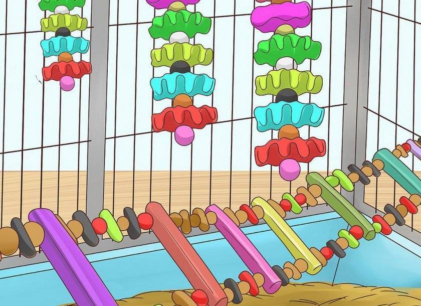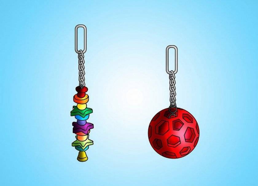 Для пернатого питомца можно подобрать две-три игрушки. Больше вешать не стоит, особенно, если клетка небольшая. В качестве игрового инвентаря может выступить колокольчик, гирлянда из разноцветных шариков и другие подвесные конструкции, большой выбор которых есть в любом зоомагазине.