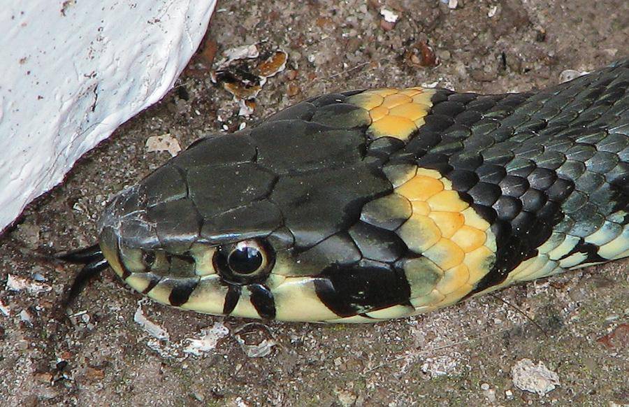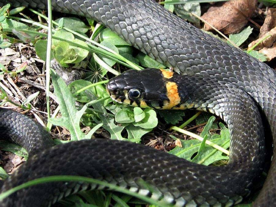 - голова ужа в области ушей украшена яркими пятнами, у гадюки — видны два ядовитых зуба.