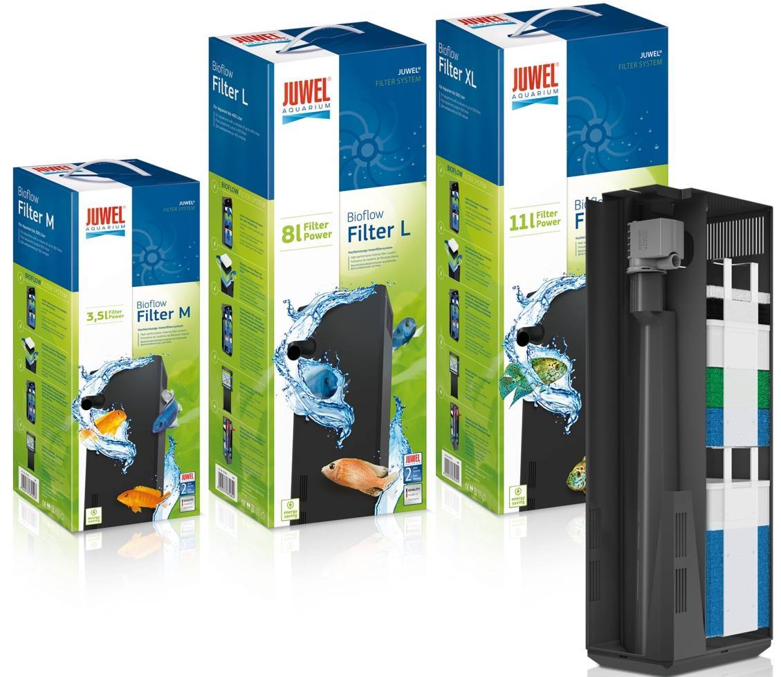 - JUWEL Bioflow 8.0. Такая система фильтрации предназначена для емкостей от 350 до 500 л. Прибор улавливает разрастающиеся колонии бактерий, химические примеси в воде и твердые отходы. Отличительной особенностью является очищение основанное на двухпоточном принципе работы. Устройство отличается бесшумностью и удобством обслуживания. все части фильтра быстро разбираются, — с этим могут справиться даже самые неопытные аквариумисты. Для удобства пользователя производитель оснастил агрегат быстрым доступом к компрессору и нагревателю. В комплект входит клей для монтажа. Из минусов можно выделить высокую цену.
