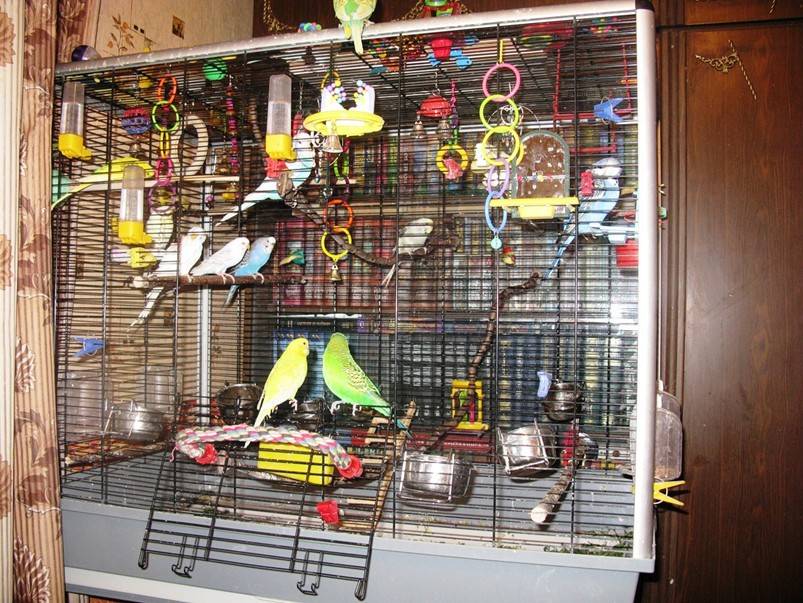 Что касается размеров клетки, то она не может быть меньше чем размах крыльев птички. А в идеале — попугайчику нужно хотя бы немного летать в самой клетке и прыгать по перекладинам.