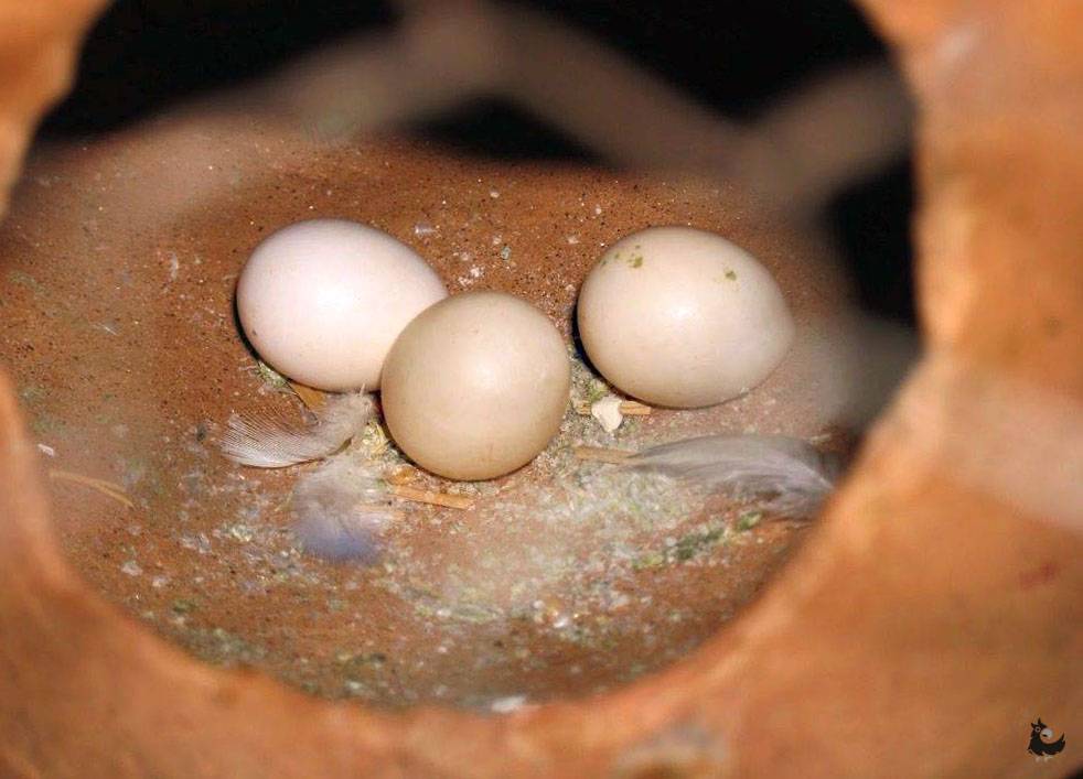 С момента освоения домика и до появления первого яйца проходит достаточно много времени – до одного месяца. После чего самка начинает откладывать яйца через день. В кладке их может насчитываться 4–6 штук. Это зависит от возраста попугаев-родителей, генетической предрасположенности и окружающими факторами.