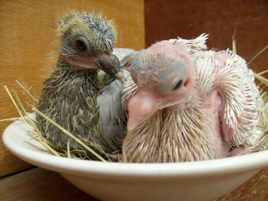 Кстати, голубята с удовольствием клюют корма для попугаев, в которых отсутствует неочищенный овёс.
