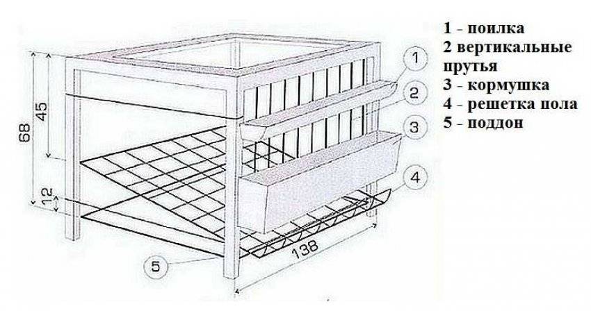 Особой разницы между клетками, сооружёнными для бройлеров и маленьких птенцов, нет. Единственное, что нужно учитывать, так это размер конструкции. Для маленьких птенцов нужно обустроить клетку, учитывая, что на 1 м2 поместится не боле 25 особей, а вот взрослых 10-15 штук.