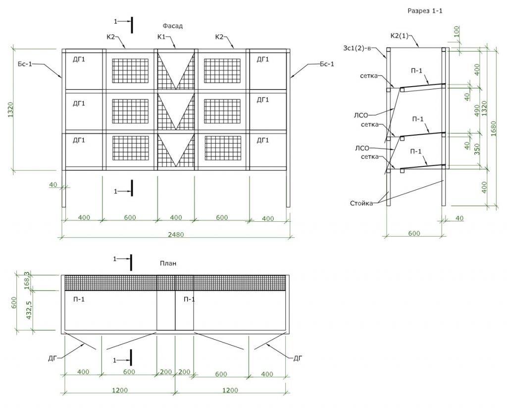 Это сооружение повышает эффективность выращивания кроликов. Конструкция состоит из трех ярусов. Вышерасположенные сдвинуты относительно нижних на ширину сетки. На каждом этаже имеется по две клетки. Кормушка – опрокидывающийся лоток, что дает возможность добавлять корм, не открывая дверцы.