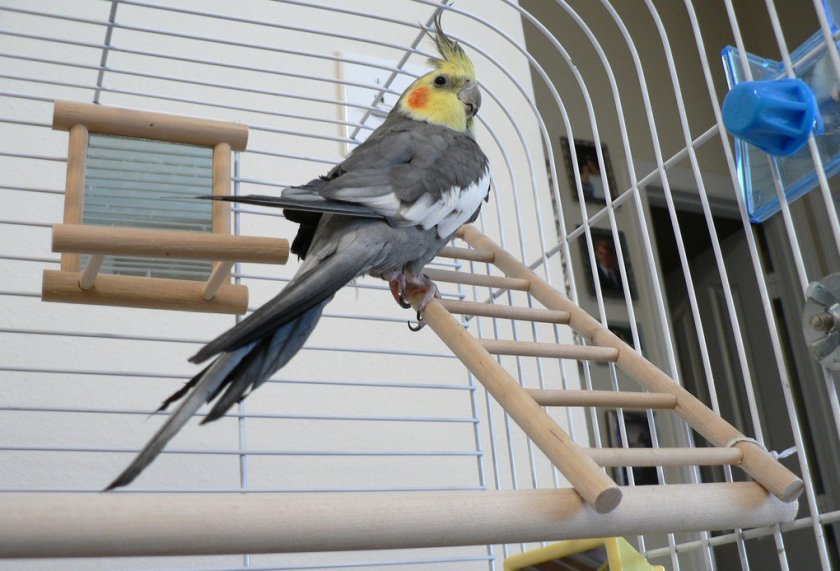 Важно! Если у кореллы будет возможность перелетать с одной жёрдочки на другую внутри клетки, он будет очень доволен. Если клетка слишком мала, насесты должны размещаться внутри с таким расчётом, чтобы, перебираясь с одной жёрдочки на другую, птица не задевала хвостом прутья