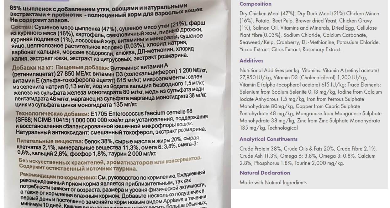 Корм под брендом Applaws отнесен к классу холистик, что объясняется не только повышенной долей (до 75%) мясных ингредиентов, но и точным указанием вида мяса – говядина, форель, ягненок, лосось, индейка, утка, курица или другое. Кроме того, в продукции с маркировкой «холистик» подробно обозначены источники питательных веществ (белков, жиров и углеводов) и обязательно – наименования животных жиров.