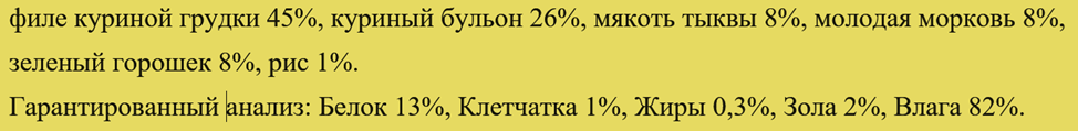 Это настоящее лакомство для кошек, которое приготовлено всего из 4-х продуктов: куриной грудки (50% от всего состава), бульона, тыквы и риса. Подходит для питания взрослых кошек. Ламинированная упаковка, которая изготовлена из пищевой фольги, прекрасно сохраняет вкус корма.