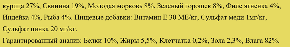 В составе присутствуют злаки, мясо и субпродукты, рыба и продукты рыбного происхождения, овощи и витамины, в том числе омега-3 и омега-6.