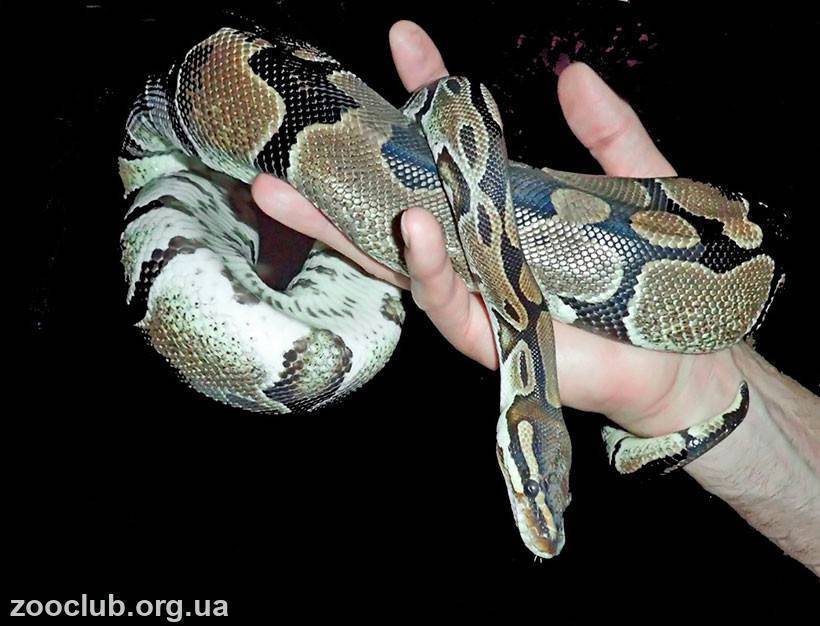 При опасности змея сворачивается в тугой шар, спрятав голову внутрь колец тела. Его потому и прозвали питон-мяч.