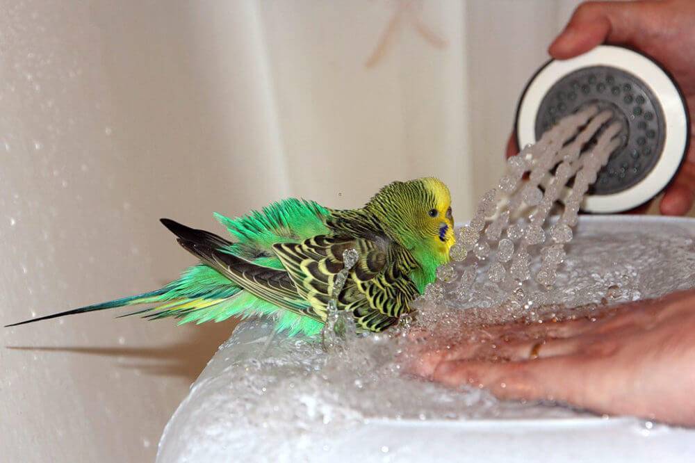Пестрый питомец предпочитает вести опрятный образ жизни: ежедневно очищает перышки, следит за своим отражением в зеркале, умывается, приглаживает хвостик, расправляет слипшиеся перья. Чтобы сохранить перышки от попадания влаги, птица взъерошивается, затем встряхивается. Генеральные купания с головой попугай проводит самостоятельно. Любимцы обожают нырять в прохладную освежающую ванну в жаркий, знойный день. Цели купания зависят от видов загрязнений. Ведь сухая чистка при помощи клюва не помогает, если: