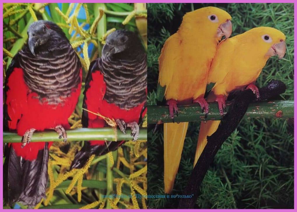 Попугай Тома Песке (слева); золотая аратинга (справа).