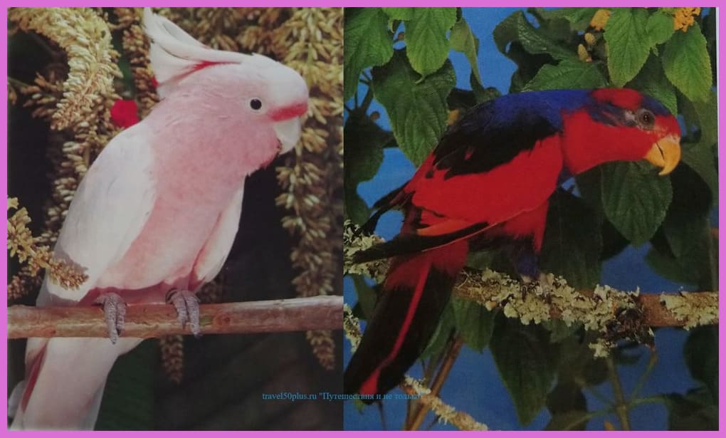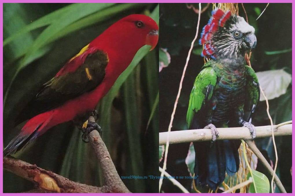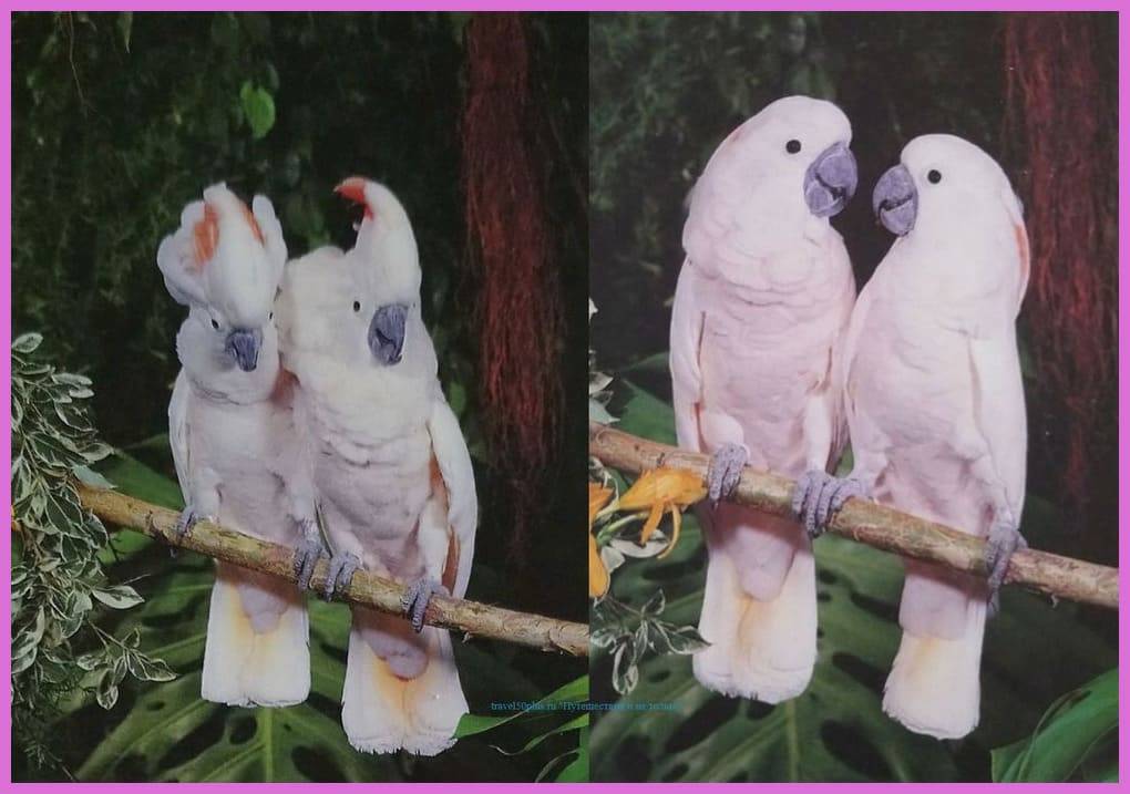 Индонезийский какаду (слева); попугай ястребиная голова (справа).