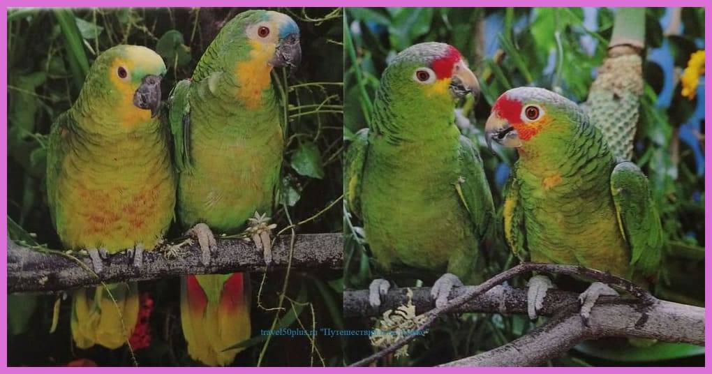 Голубой амазон (слева); красно-юкатанские амазоны (справа).