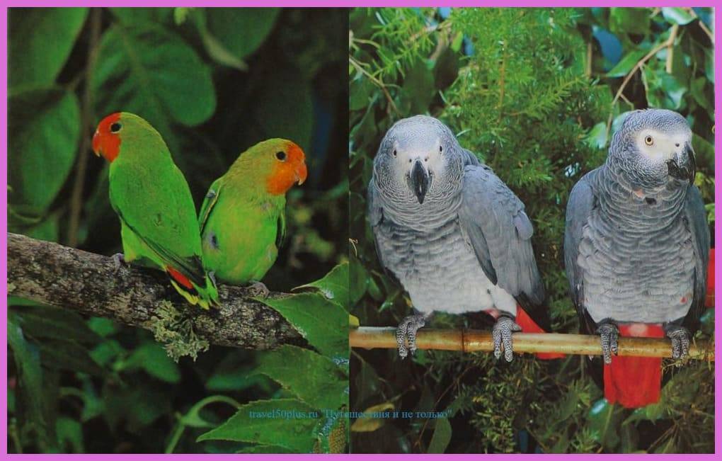 Самый многочисленный отряд парка родом из тропиков. Попугай ястребиная голова родом из Южной Америки. Амозоны родом из Центральной и Южной Америки, Карибских островов. Попугаи Ара родом из Центральной и Южной Америки.