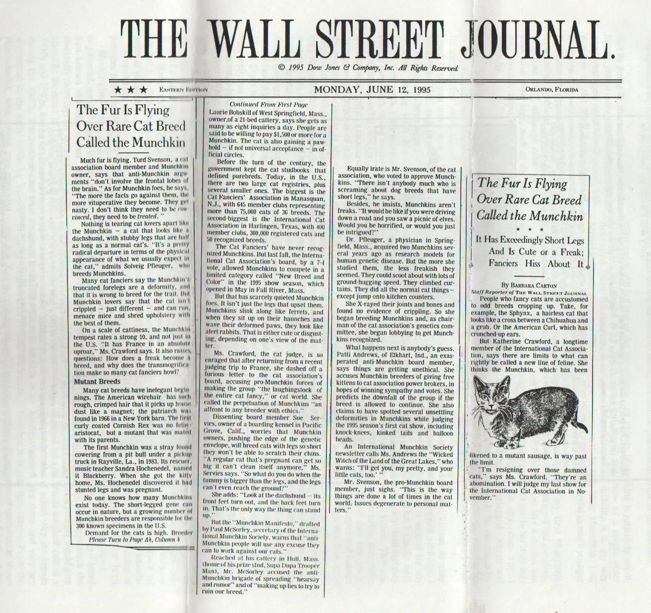 Популярность кошка получила, когда появилась на обложке World Street Journal в1995. В России манчкин появился в 2001.