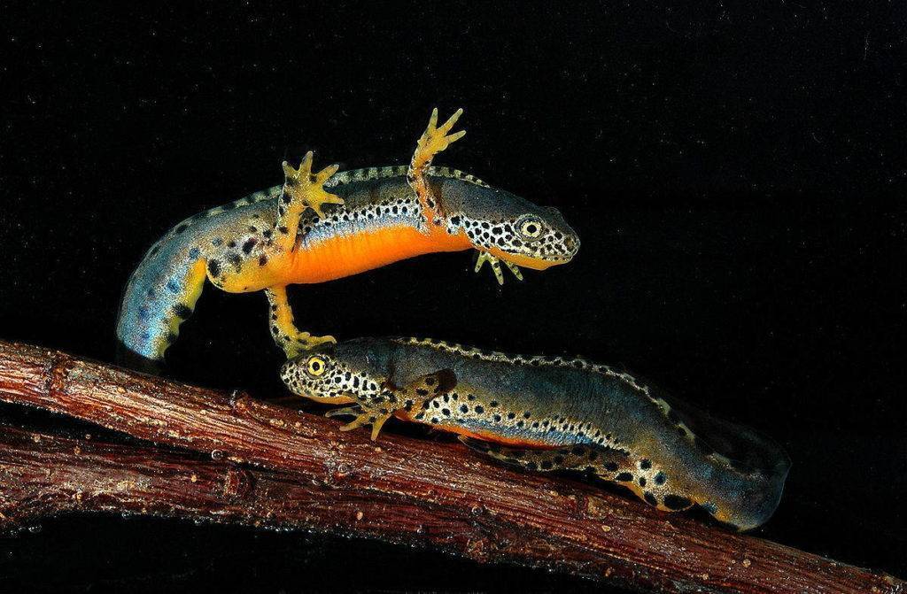 Возвратившись с зимовки, самец тритона обыкновенного поджидает в водоеме самку. Увидев ее, он подплывает, обнюхивает и трогает ее за морду. Убедившись, что перед ним особь противоположного пола, он начинает танцевать.