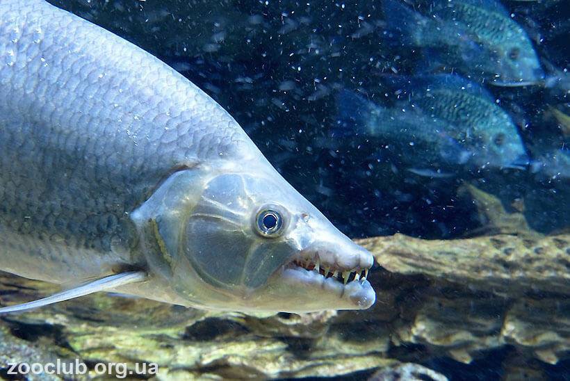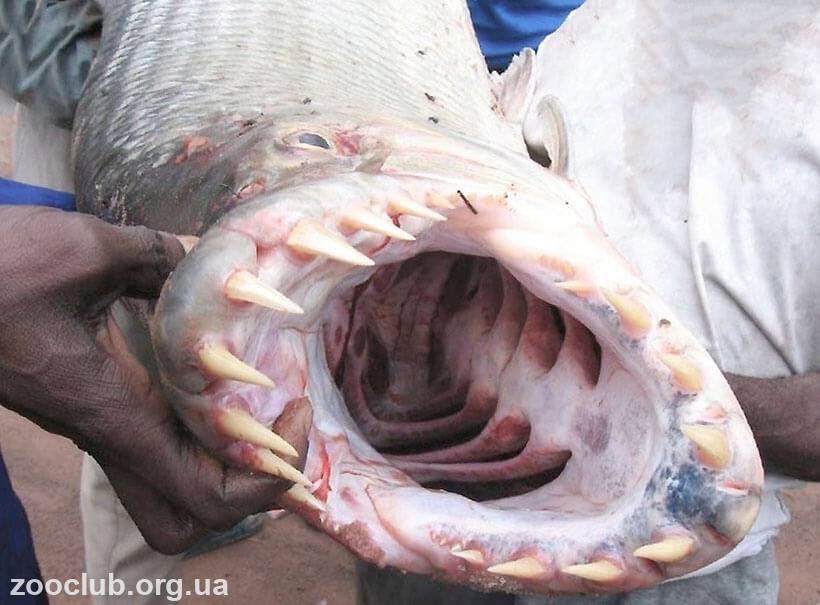Конечно же, встретить рыбу голиафа в обычном, домашнем аквариуме практически невозможно, однако, ее содержат в выставочных аквариумах и в зоопарках. Дело в том, что в природе гигантский гидроцин вырастает до 150 см и может весить около 50 кг. Один взгляд на ее зубы и вы сразу понимаете что такая рыбка питается далеко не растительностью. Это активный и опасный хищник, она похожа на другого всем известного хищника — пиранью, но в отличие от нее гораздо более крупная. Своими огромными зубами он может вырывать целые куски плоти из тела своих жертв.